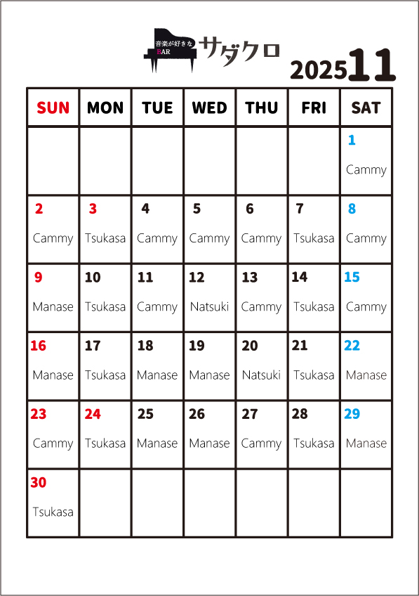 29Octサダクロ【1号店】2025年11月 営業日程&ピアニストスケジュールTweet0Share on Tumblr 営業時間 日曜から木曜 19:00-1:00(ピアノ演奏23:30まで) 金曜、土曜、祝前日 19:00-翌3:00(ピアノ演奏ラストまで)