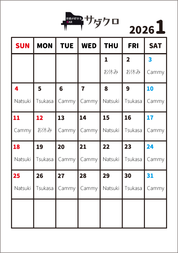 25Decサダクロ【1号店】2026年1月 営業日程&ピアニストスケジュールTweet0Share on Tumblr 営業時間 日曜から木曜 19:00-1:00(ピアノ演奏23:30まで) 金曜、土曜、祝前日 19:00-翌3:00(ピアノ演奏ラストまで)