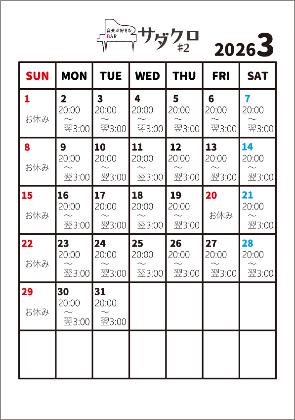 サダクロ♯2【2号店】 2026年3月 営業日程